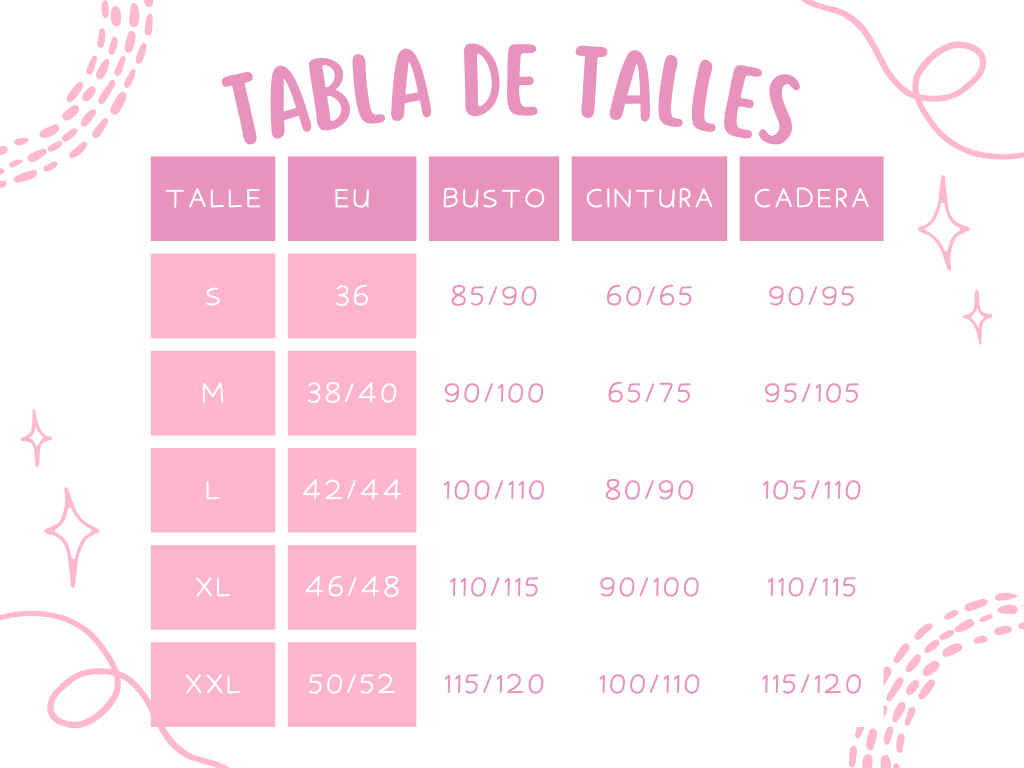 Tene en cuenta que la tabla es una mera guía, no refleja la medida exacta de todas las prendas!